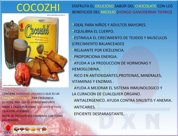 El Cocozhi está formulado a base de la más fina cocoa con extracto de Ganoderma,